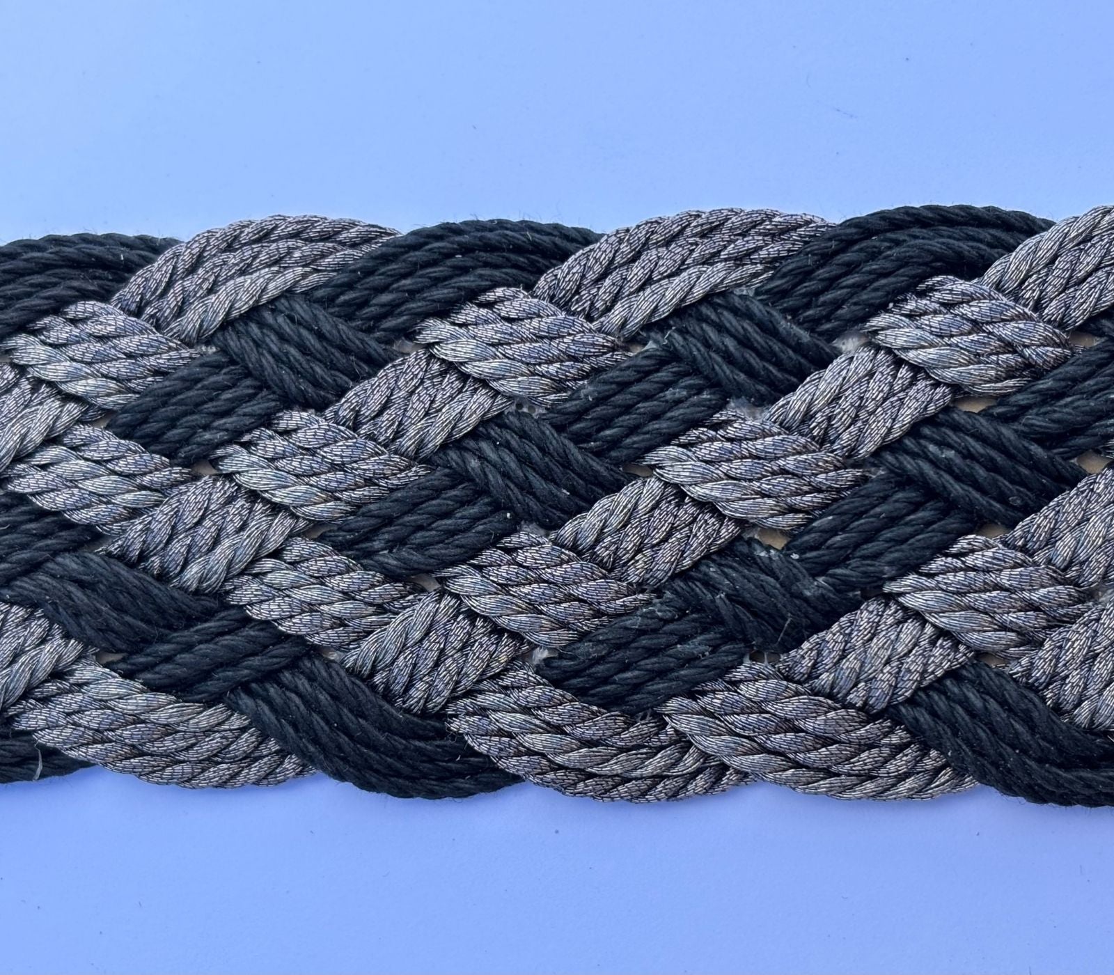 Treccia “Taormina” con larghezza 45 mm, realizzata con filati laminati sintetici nei toni nero e peltro che conferiscono un effetto luminoso e materico.